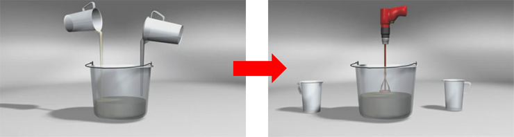 将两种不同性质的、按比例配制完成的树脂,倒入一敞口容器(铁制品或塑料制品)内,用搅拌器搅拌,做到搅拌充分,颜色均匀。